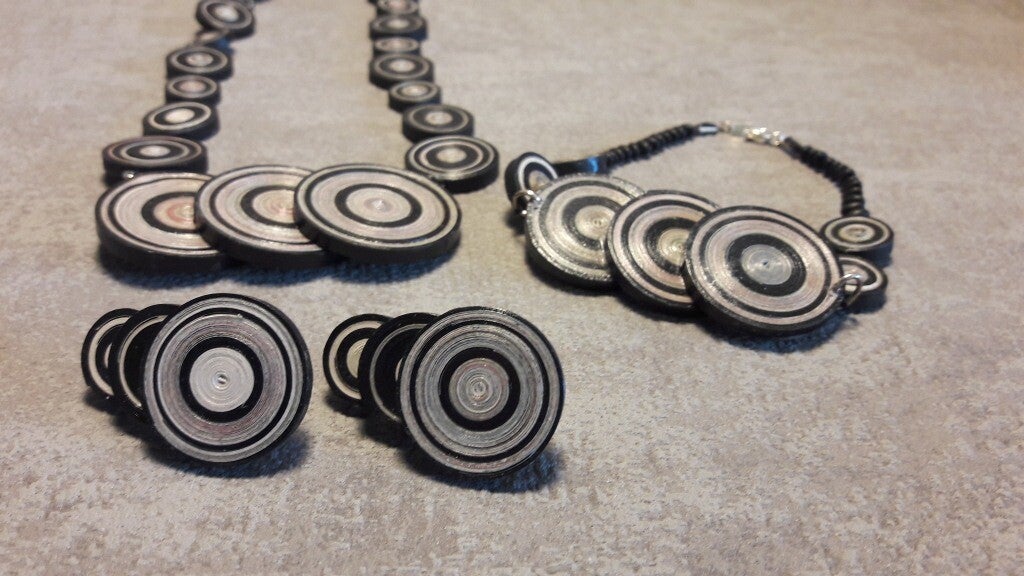 Le collier est composé de 21 "perles" rondes de 3 diamètre différent. Les cotés sont réalisés avec 9 "perles", une alternance entre les petites et les moyennes. Le centre est fait lui de 3 grosses "perles" rondes qui se chevauchent. Les "perles" sont fixées entre elles par des pitons à visser. Elles sont toutes fabriquées en papier journal et en papier noir. L'épaisseur du collier est de 3mm et le centre est de +-6mm.