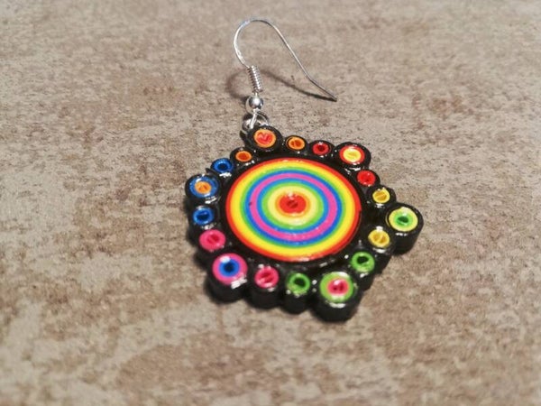 Description : Le bracelet monté sur lacet, est composé d'une pièce centrale multicolore entourée de petites pièces rondes et de deux ronds multicolores de même taille que le rond central.