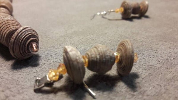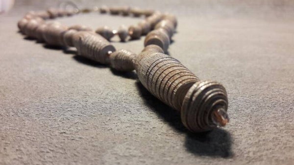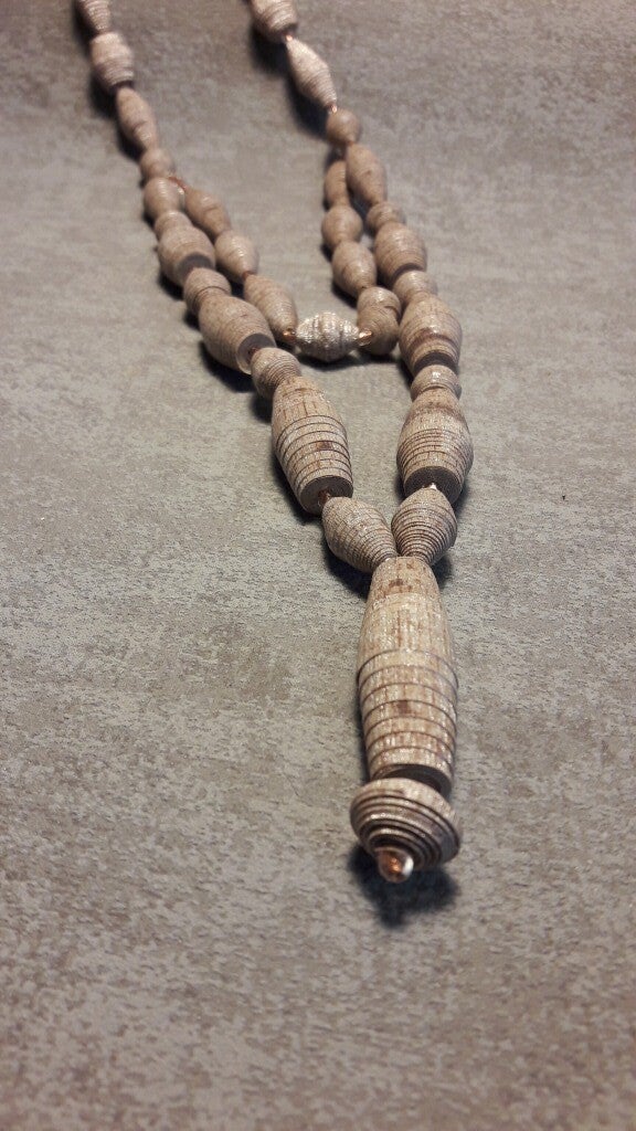 Description : Le collier est composé de perles de différentes tailles et formes. La matière et l'aspect du papier une fois travaillé peut faire penser à du bois.Entre chaque perle, des facettes.