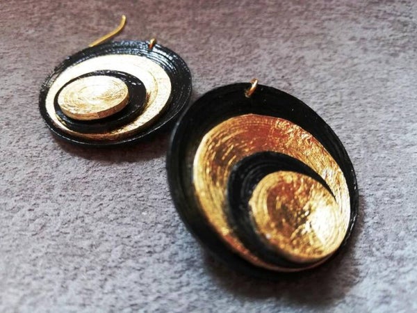 Les boucles d'oreilles sont composées de 4 "perles" rondes bombées de différentes tailles. Une alternance entre le noir et des feuilles d'or - argent - bronze ou multicolore. Son diamètre est de 25mm pour une épaisseur totale de +-6mm.
