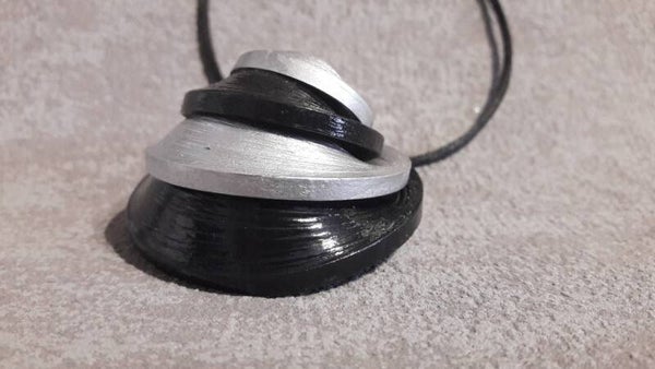 Le pendentif est composé de 4 "perles" rondes déformées de différentes tailles. Une alternance entre le noir et des feuilles d'or - argent - bronze ou multicolore. Son diamètre est de 80mm. Il est disponible en 2 épaisseur 3mm ou 1,5mm pour chaque "perles" rondes. Soit une épaisseur totale de +-12mm pour le plus épais et +-6mm pour celui en 1.5mm.
