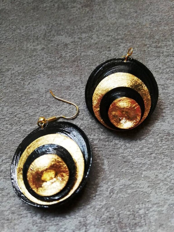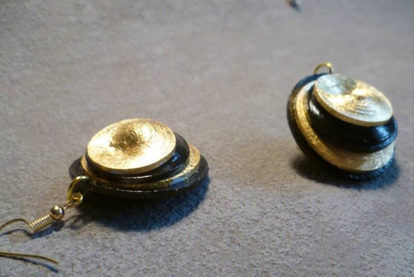 Les boucles d'oreilles sont composées de 4 "perles" rondes déformées de différentes tailles. Une alternance entre le noir et des feuilles d'or - argent - bronze ou multicolore. Son diamètre est de 25mm pour une épaisseur totale de +-6mm.