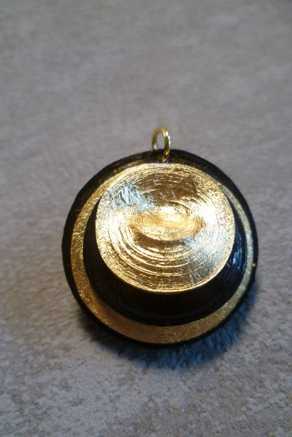 Description : Le pendentif est composé de 4 "perles" rondes déformées de différentes tailles. Une alternance entre le noir et des feuilles d'or - argent - bronze ou multicolore. Son diamètre est de 80mm. Il est disponible en 2 épaisseur 3mm ou 1,5mm pour chaque "perles" rondes. Soit une épaisseur totale de +-12mm pour le plus épais et +-6mm pour celui en 1.5mm.