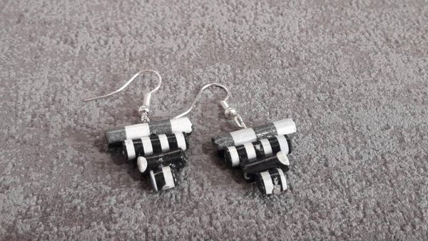 Description : Les boucles d'oreilles sont composés de 3 "perles" tubes de taille et de motif différent. Les "perles" tubes vont du plus grand au plus petit, elles sont recouvertes de décopatch.