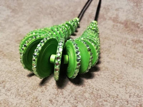 Le collier est réalisé dans une gamme de tons. Ici en vert, les grandes "perles" sont un ton plus foncé que les "perles" intermdiaires.