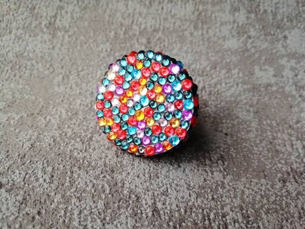 La bague est composée d'une "perle" ronde recouverte de petits strass de toutes les couleurs.
