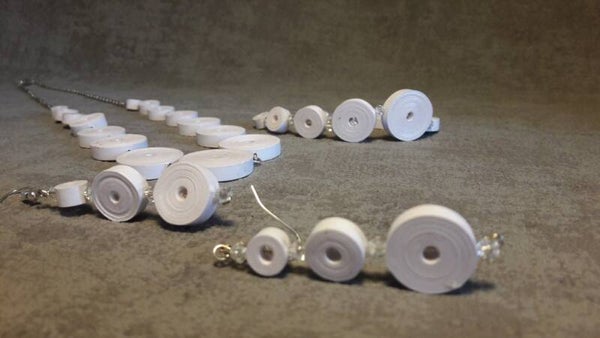 Les boucles d'oreilles sont réalisées avec 3 "perles" rondes de 3 tailles différentes allant de la plus petite à la plus grande (du haut vers le bas). Entre chaque "perle" de papier vous retrouverez une perle de rocailles de la même couleur que les "perles" de papier.