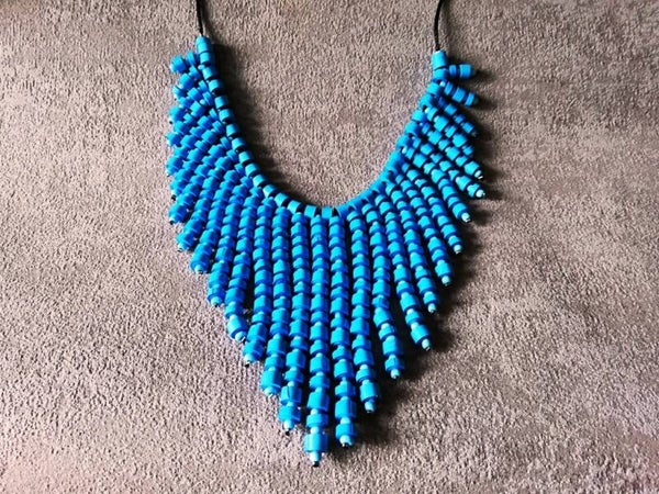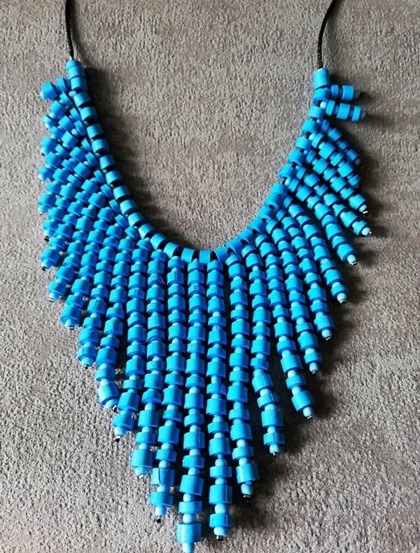 Description : Le collier monté sur lacet noir, est composé de 286 "perles" rondes de grosseur identique mais de 2 épaisseurs différentes (3mm et 5mm) et de 285 perles de couleur.