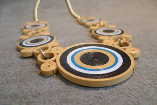 Le collier monté sur fil de nylon est composé de 5 formes comprenant 7 "perles" rondes de différentes taille, motif et forme. Soit un total de 35 pièces.