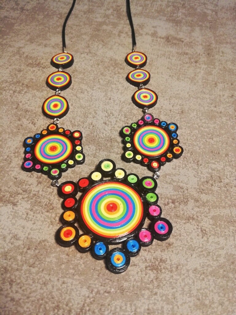Sur les côtés de cette pièce maîtresse 2 formes identiques en miniature, puis 6 "perles" rondes Multicolore. Le collier est terminé par un lacet Noir.