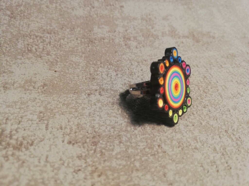 Le bracelet monté sur lacet, est composé d'une pièce centrale multicolore entourée de petites pièces rondes et de deux ronds multicolores de même taille que le rond central.