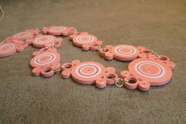 La pièce centrale est la composée d'une grosse "perle" ronde dans lilas et rose pour le deuxième. Sur ces côtés 3 petites "perles" servants d'attache. Elles seront reproduites sur les 4 autres formes. Les 4 formes restantes sont elles composées d'une pièce centrale, réplique miniature de la pièce centrale. Pour terminer le collier, des perles de rocailles dans les tons choisis.