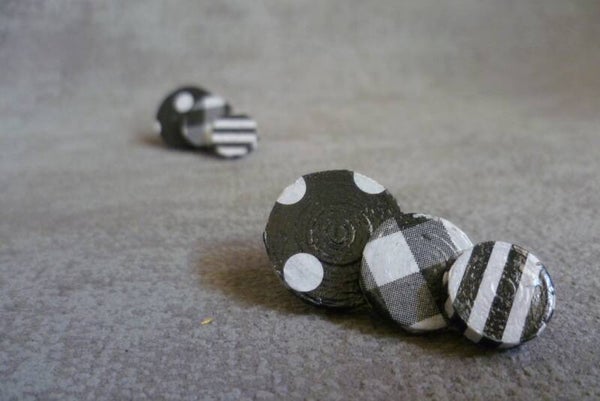 Les boucles d'oreilles sont composées de 3 "perles" rondes de différentes tailles. Elles sont recouvertes de Déco Patch de 3 motif différents mais dans le même esprit. Ici on a rond, carré et lignes. Son diamètre est de 25mm.