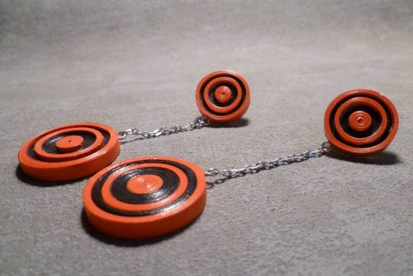 Les boucles d'oreilles pendantes sont composées de 2 "perles" rondes de taille différentes mais de même motif. Elles sont réalisées en 2 épaisseur et la plus grosse est fixée à l'aide d'un piton à visser et d'une chaîne couleur argent sur la plus petit qui se met à l'oreille.