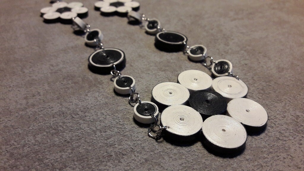 Description : Le collier monté sur câble nylon et pitons à visser , est composé de 39 "perles" rondes de taille, motif et couleur différente. La fleur de base est composée d'une "perle" centrale noire et de 6 "pétales" rondes grises. La finition de cette base est la bande de couleur noire tout autour.