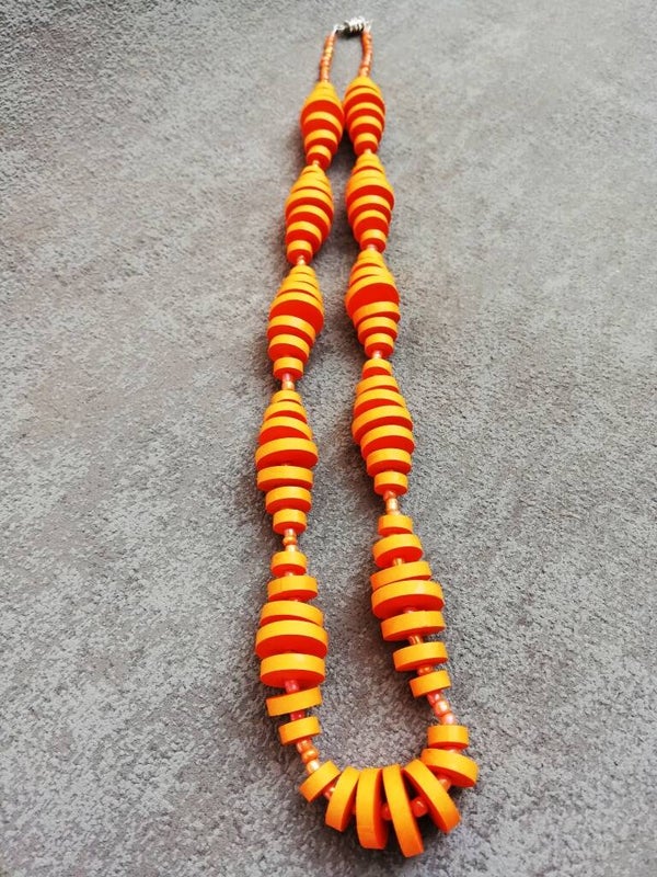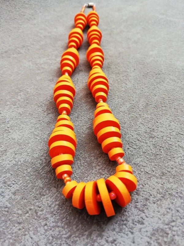 Le Collier "décalé"... composé de 11 séries de 7 pièces, formées par 77 "perles" rondes de tailles différentes. Les "perles" se succèdent de la plus petite à la plus grande et inversément. Chaque "perle" est séparée par une perle de rocaille et entre chaque serie 2 perles de rocailles.