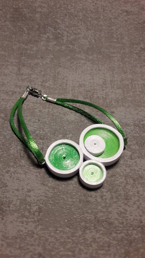 La base de ce bijoux est le blanc. Ici le bracelet est dans les tons vert. Dégradé de vert clair, moyen et foncé.