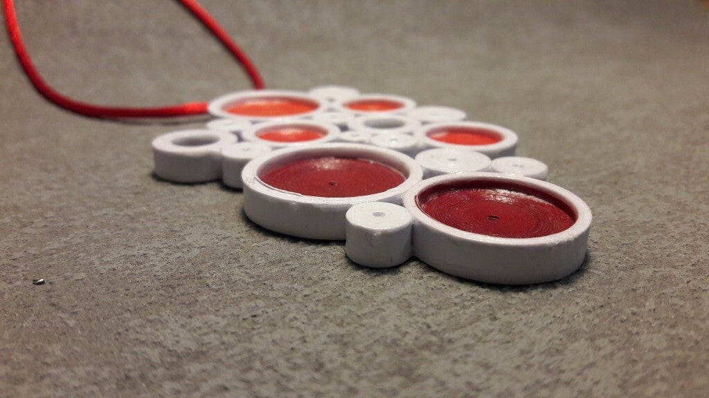 Description : Le pendentif monté sur lacet couleur, est composé de 17 "perles" rondes de différentes tailles, épaisseur et couleur.