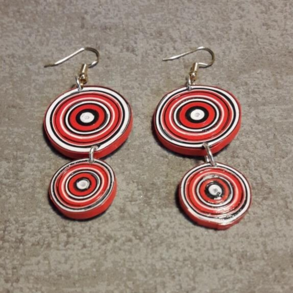 Les boucles d'oreilles montées sur crochet, sont composées de 2 ou 3 "perles" rondes de différents diamètre. Les motifs sont les mêmes pour chaque "perle" mais en diminuant de diamètre. Elles sont fixées entre elles par des pitons à visser. Son épaisseur est de 3mm.