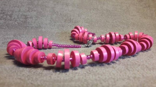 Le Collier "décalé"... composé de 11 séries de 5 pièces, formées par 55 "perles" rondes de tailles différentes. Les "perles" se succèdent de la plus petite à la plus grande et inversément. Chaque "perle" est séparée par une perle de rocaille et entre chaque serie 2 perles de rocailles.