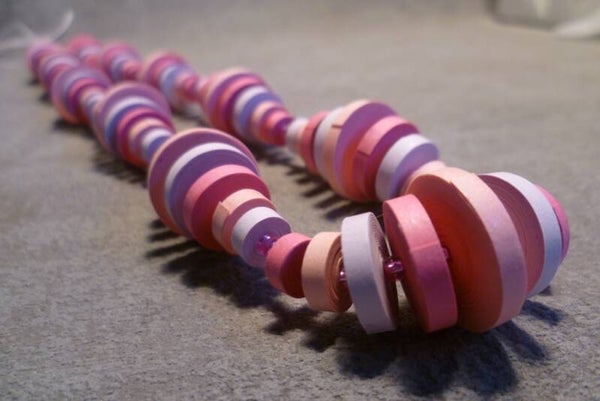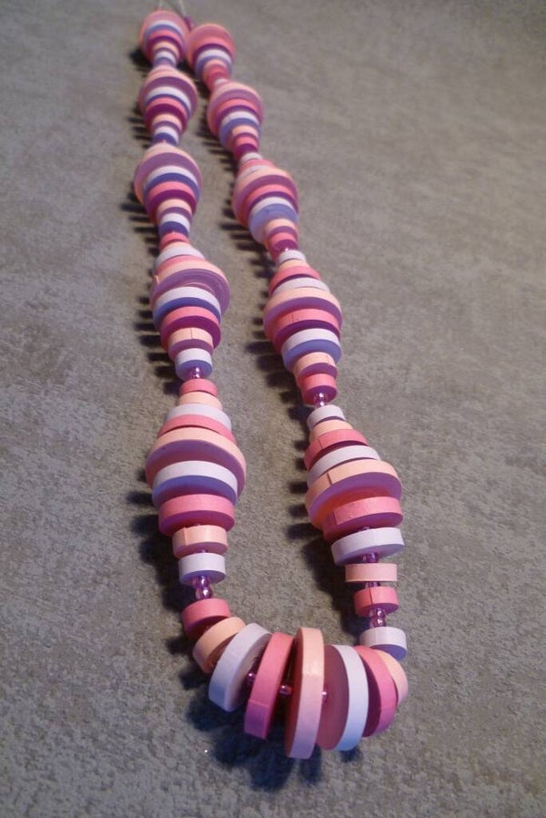 Le Collier "décalé"... composé de 11 séries de 9 pièces, formées par 99 "perles" rondes de tailles et de couleur différentes. Les "perles" se succèdent une clair, une foncée, de la plus petite à la plus grande et inversément. Chaque "perle" est séparée par une perle de rocaille et entre chaque serie 5 perles de rocailles.