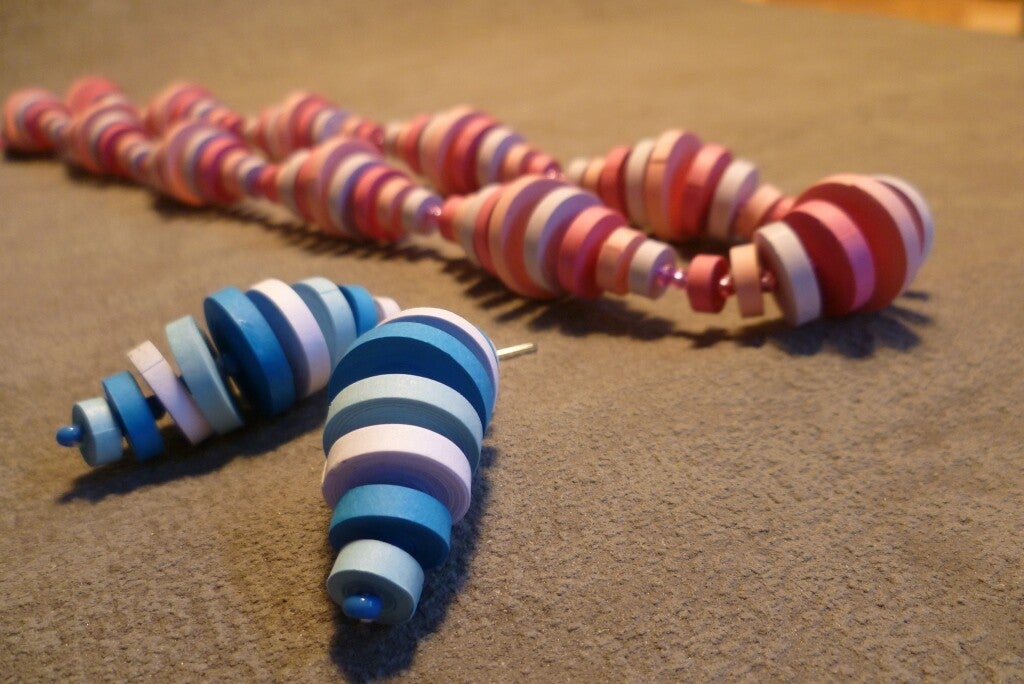 Description : Les boucles d'oreilles sont composées d'une série de 9 "perles" rondes de taille et de couleur différentes. Les "perles" se succèdent une clair, une foncée, de la plus petite à la plus grande et inversément. Chaque "perle" est séparée par une perle de rocaille.