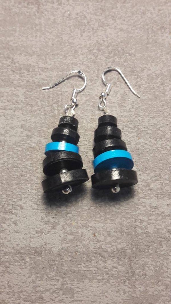 Les boucles d'oreilles sont composées d'une série de 5 "perles" rondes de taille différente. Ici, elles sont représentées avec une base noir et une touche de bleu. A vous de choisir les couleurs que vous désirez.