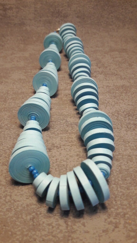 Description : Le Collier "décalé"... composé de 11 séries de 7 pièces, formées par 77 "perles" rondes de tailles différentes. Ces séries forment des cônes. Les "perles" se succèdent de la plus petite à la plus grande et ainsi de suite pour les autres cônes. Chaque "perle" est séparée par une perle de rocaille et entre chaque serie 2 perles de rocailles.